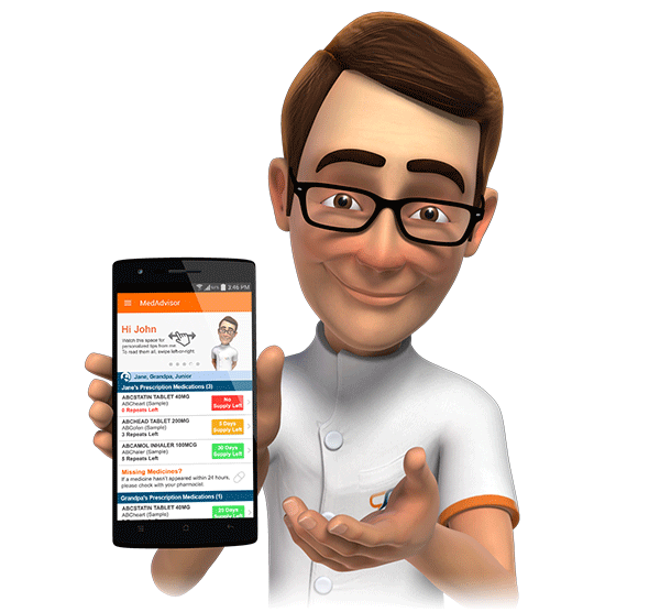 It covers the key benefits of MedAdvisor for a patient, including the home screen, medicine details, fill-my-script reminders, see-my-doctor reminders, take-my-med reminders and tap-to-refill capabilities.